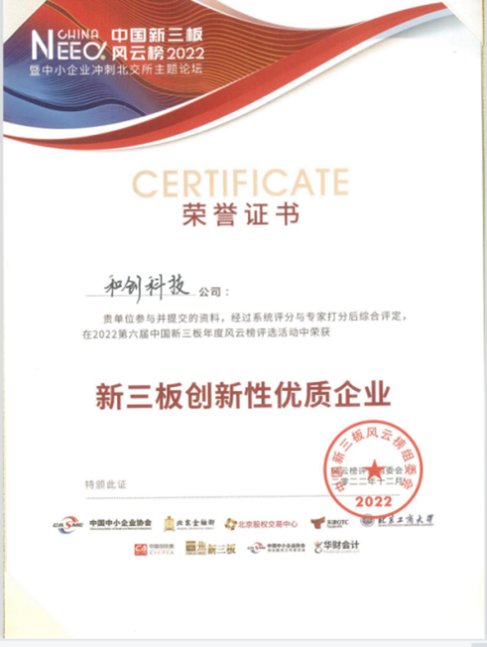 和創(chuàng)科技憑借技術突破、產(chǎn)品創(chuàng)新、細分市場優(yōu)勢及拓展?jié)摿Φ榷喾矫鎯?yōu)勢,榮獲北京市經(jīng)濟和信息化局2021年度第二批認定的專精特新“小巨人”企業(yè)榮譽稱號。