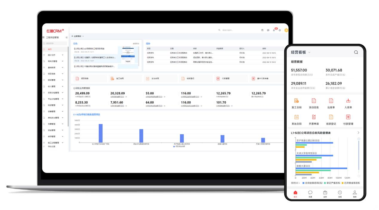 在工程項目管理領域,紅圈在 PaaS 平臺基礎上深入結合建筑工程企業的業務場景,針對其現金流管理薄弱、成本不可控、項目進度滯后、質量問題頻發和安全風險較多等痛點,通過資金管理、成本管理、物資管理、安全質量管理、投標管理、勞務管理、證照管理等功能模塊,使執行人員業務流程標準化、透明化。