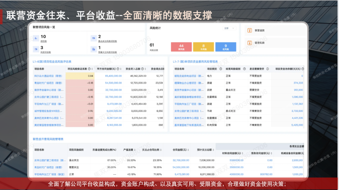 當(dāng)前公司數(shù)字化程度較低,通過簡(jiǎn)單的oa軟件、Excel表格、微信群、例會(huì)等傳統(tǒng)的管理方式進(jìn)行管理。近幾年隨著公司省外業(yè)務(wù)的拓展,項(xiàng)目越來(lái)越大,傳統(tǒng)的低效管理模式已經(jīng)無(wú)法滿足日常的管理需求。公司聯(lián)營(yíng)項(xiàng)目較多,個(gè)別項(xiàng)目出現(xiàn)資金挪用,虛開套現(xiàn),造成不必要的法律訴訟官司,甚至資金賬戶被凍結(jié)。此外,公司自營(yíng)項(xiàng)目,人材機(jī)等各項(xiàng)成本,當(dāng)前人工進(jìn)行把控,項(xiàng)目利潤(rùn)不達(dá)預(yù)期;人工進(jìn)行統(tǒng)計(jì),需要扒賬,實(shí)效性差,財(cái)務(wù)報(bào)表不能實(shí)時(shí)動(dòng)態(tài)呈現(xiàn)。
