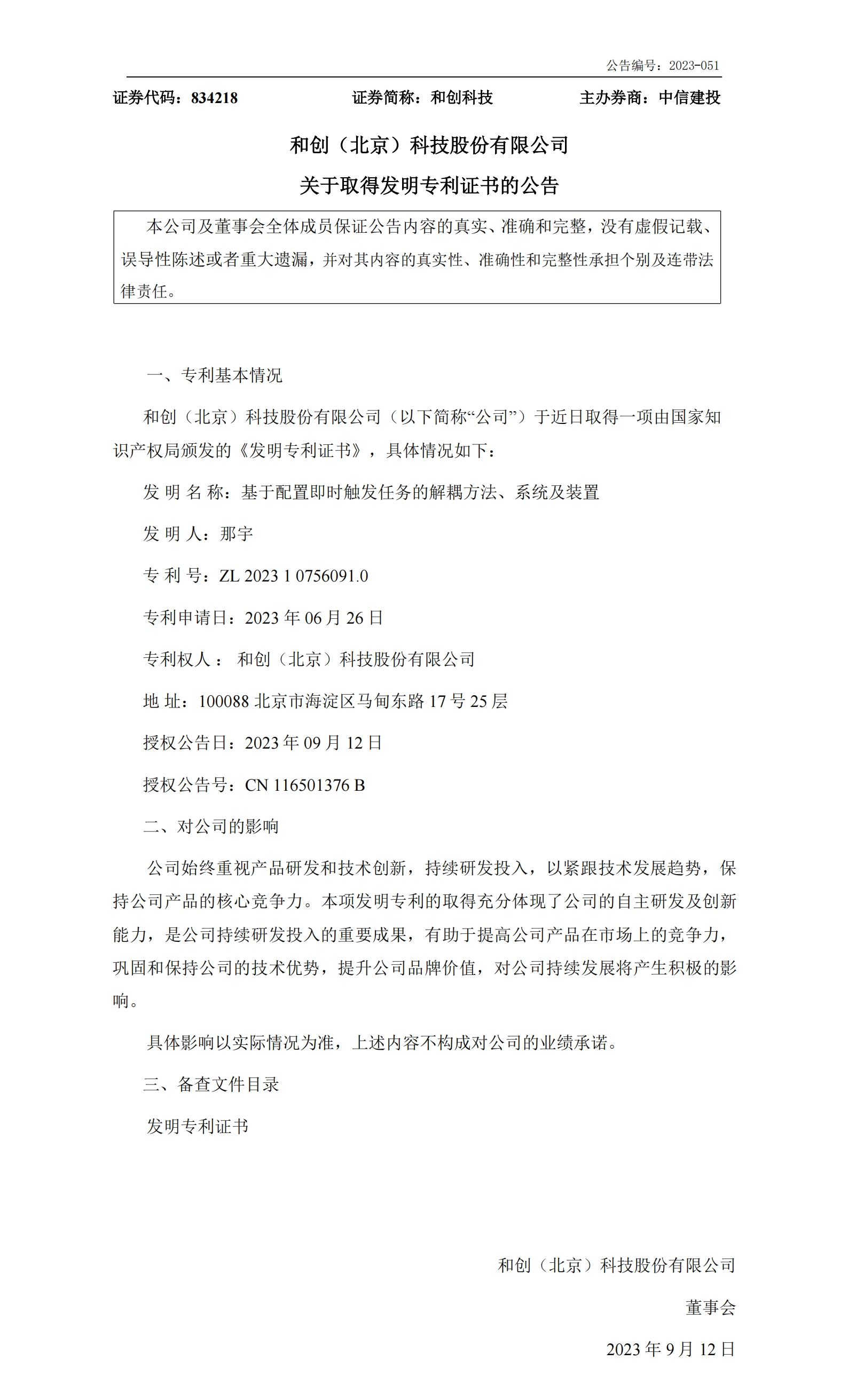 公司始終重視產品研發和技術創新,持續研發投入,以緊跟技術發展趨勢,保持公司產品的核心競爭力。這兩項發明專利的取得充分體現了公司的自主研發及創新能力,是公司持續研發投入的重要成果,有助于提高公司產品在市場上的競爭力,鞏固和保持公司的技術優勢,提升公司品牌價值,對公司持續發展將產生積極的影響。