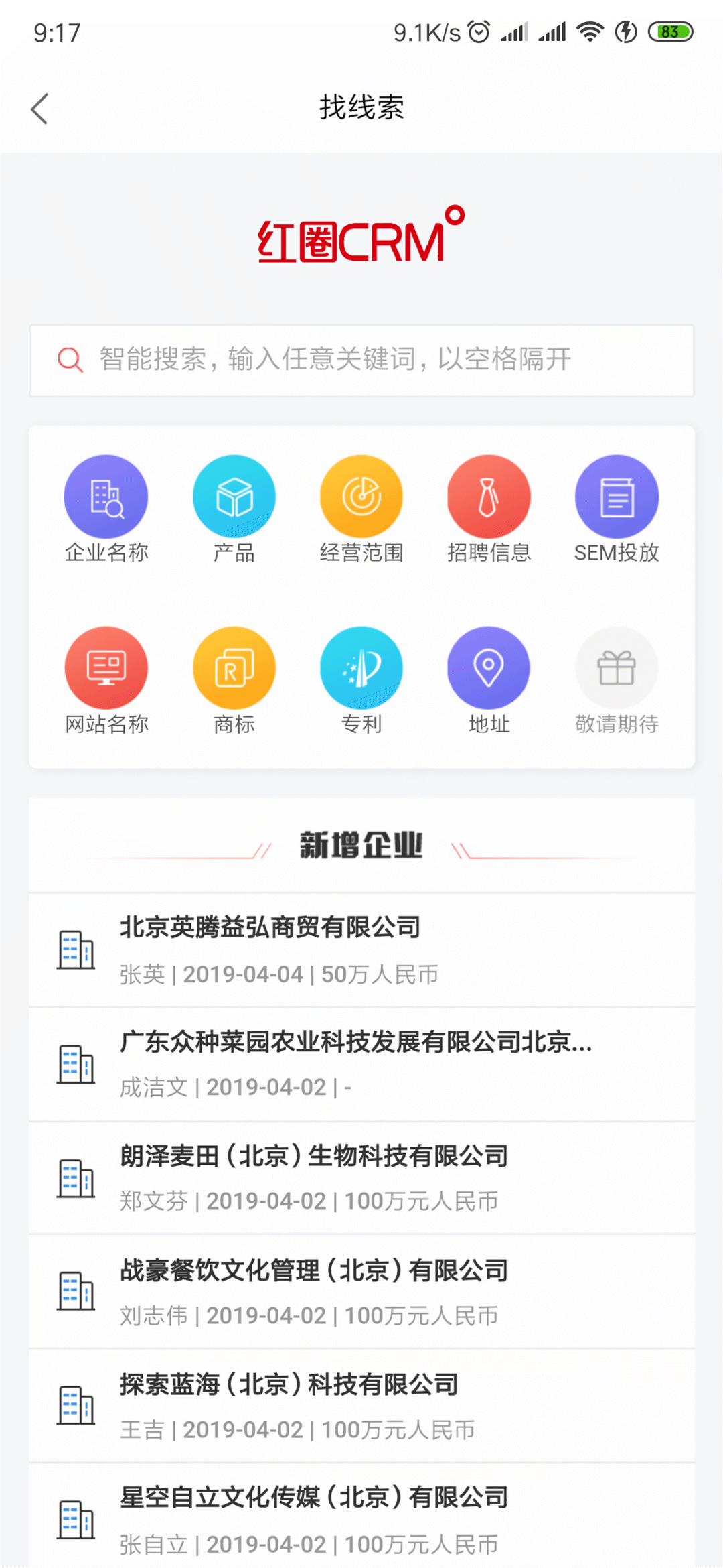 在V1904版本中,紅圈CRM與專業大數據平臺實現打通,能夠幫助企業實現目標客戶工商注冊信息的智能獲取及回填。當銷售人員創建或編輯線索/客戶時,紅圈CRM可自動檢索到目標客戶的工商信息,并將有價值的信息自動回填。