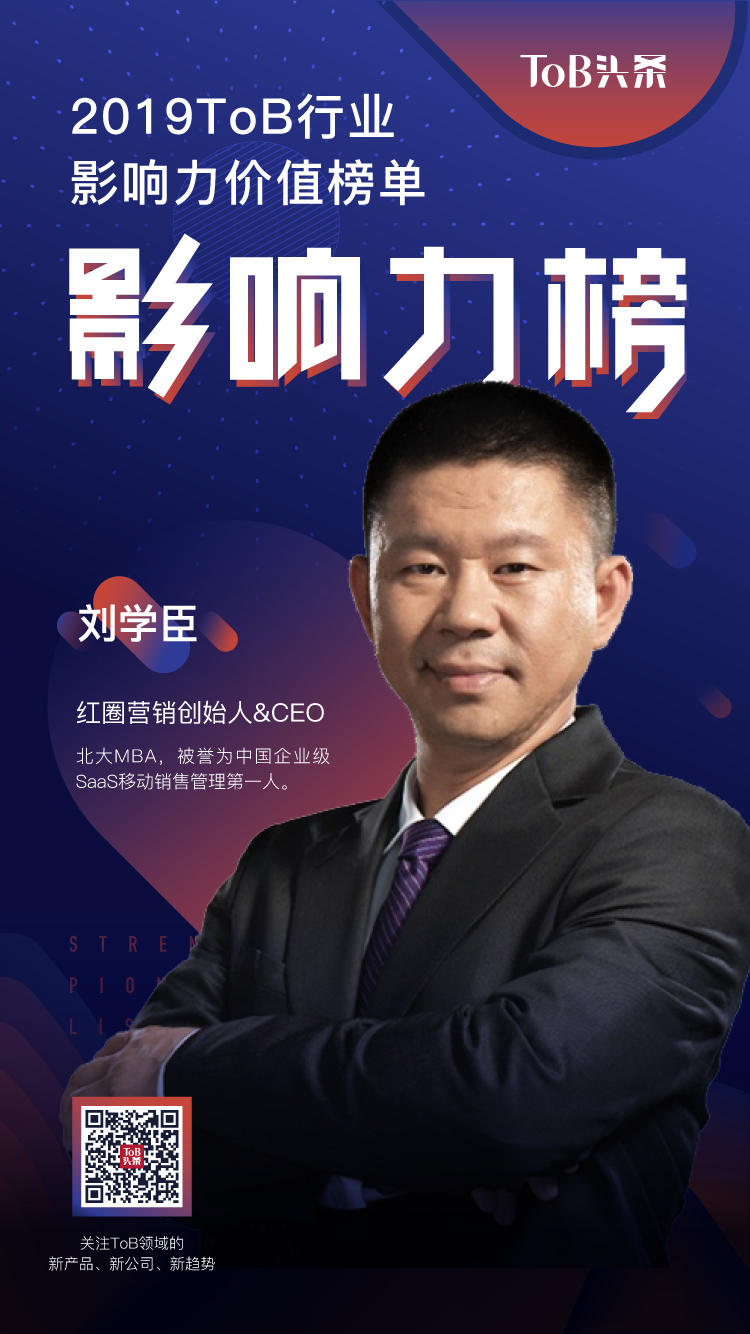 近日,由“ToB行業(yè)頭條”主辦的【ToB行業(yè)2019影響力價(jià)值榜單——人物榜】重磅發(fā)布,紅圈營(yíng)銷(xiāo)創(chuàng)始人兼CEO劉學(xué)臣榮登“ToB行業(yè)影響力人物榜”。