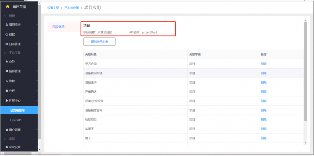 1)開通項(xiàng)目多維度后,在后臺(tái)已安裝應(yīng)用中,可以看到“項(xiàng)目應(yīng)用”;打開后可以看到項(xiàng)目上已經(jīng)增加的部門字段名稱和API