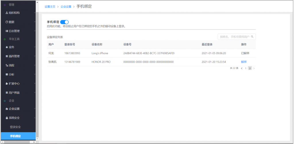 開啟后,用戶在手機(jī)端登錄綁定后,會(huì)生成一條綁定數(shù)據(jù)
