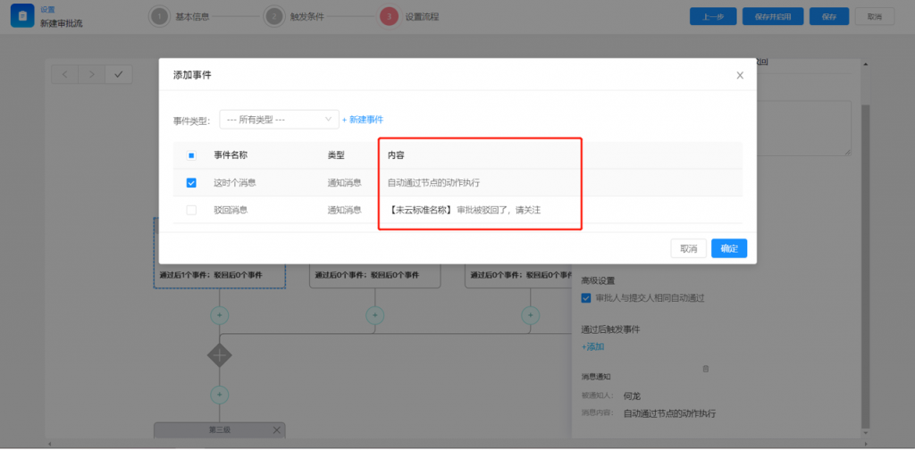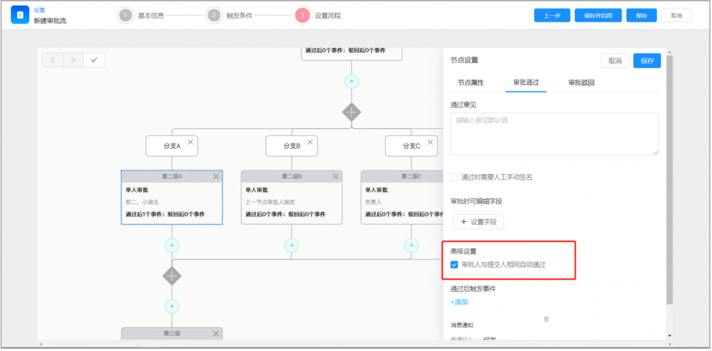 2)審批流節(jié)點(diǎn),可配置當(dāng)與提交人相同時(shí),自動(dòng)通過,減少重復(fù)操作