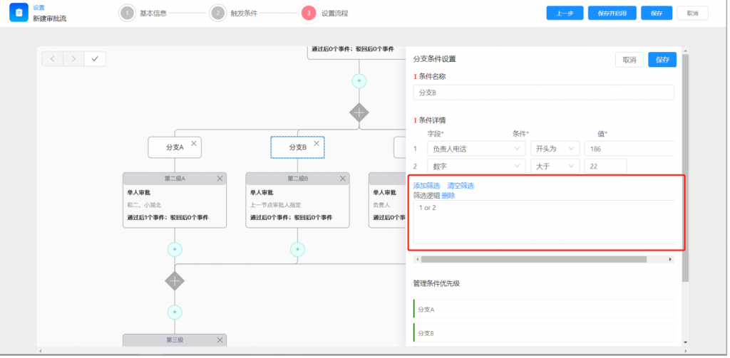 7)審批流分支條件,支持高級(jí)篩選邏輯