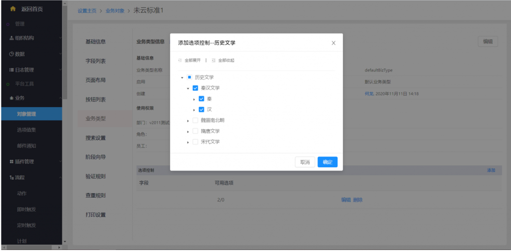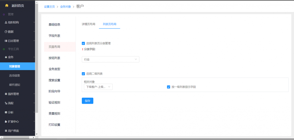 對(duì)象列表布局,設(shè)置二姐列表功能時(shí),如果選擇的下游對(duì)象是本對(duì)象,則可以選擇按一節(jié)大列表顯示字段配置,也可以自己手動(dòng)配置
