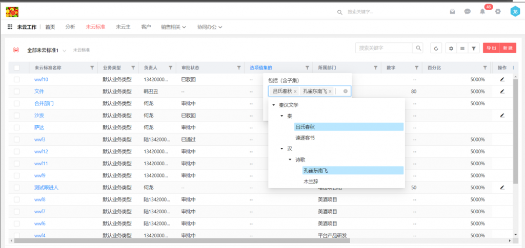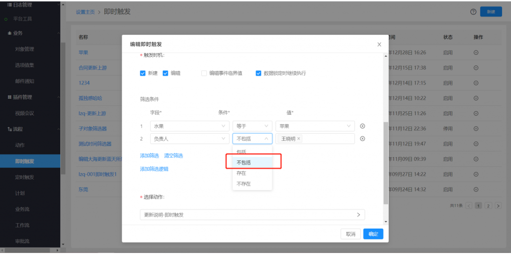 6)后臺(tái)配置的篩選條件中,員工和部門支持“不包括”條件,如審批流的分支條件
