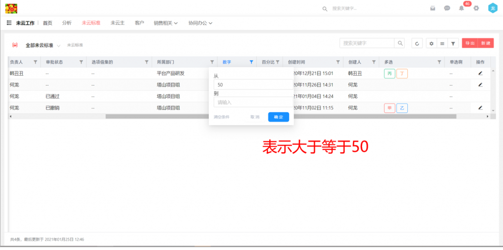 7)數(shù)據(jù)列表中,數(shù)值型字段在表頭篩選時(shí)可以只輸入一邊,或者兩邊輸入相同數(shù)值,進(jìn)行篩選