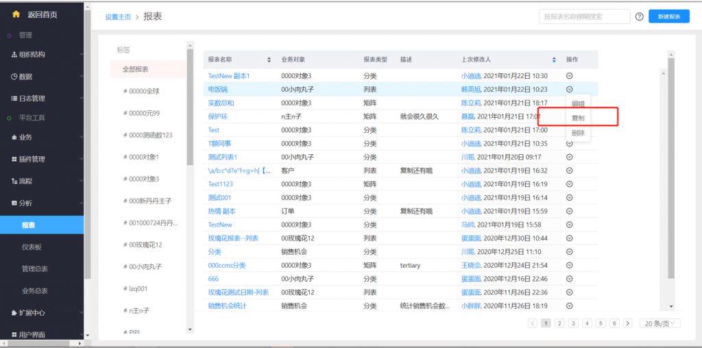 1)報(bào)表支持復(fù)制,方便同一個(gè)對(duì)象的多條件報(bào)表快速創(chuàng)建