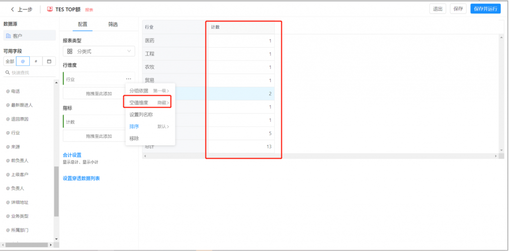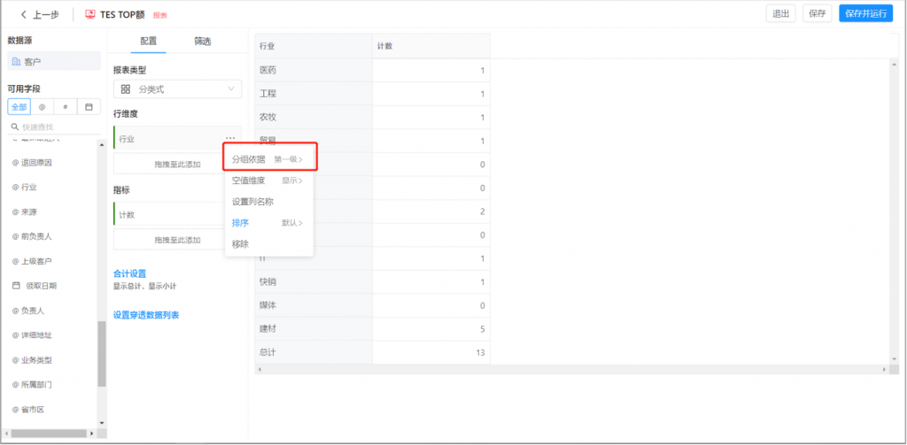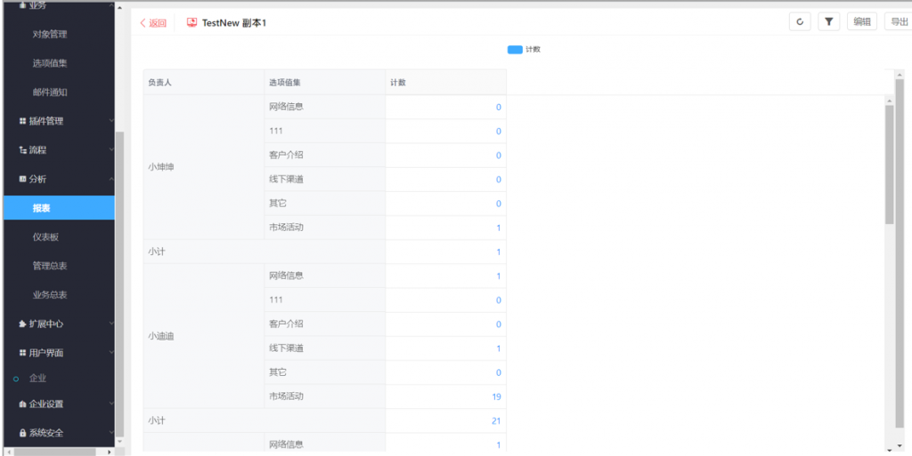 2)選項(xiàng)值集的單選字段,在作為維度時(shí),可以分層級(jí)統(tǒng)計(jì),類似部門;比如選擇一級(jí)進(jìn)行查看,每行維度會(huì)匯總當(dāng)前一級(jí)選項(xiàng)以及所有下級(jí)選項(xiàng)的數(shù)據(jù)