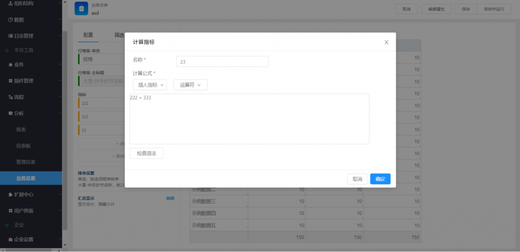 1) 與管理總表類似,業(yè)務(wù)總表中增加了計(jì)算指標(biāo),支持指標(biāo)列之間進(jìn)行簡單四則運(yùn)算,滿足更多的分析場景