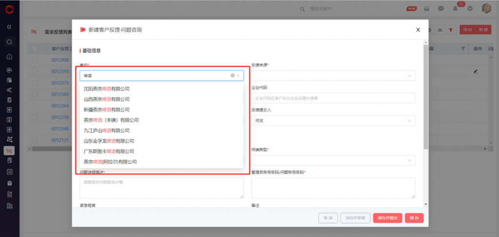 1)新建編輯數(shù)據(jù)時(shí),查找關(guān)系字段支持快速搜索和選擇,免除進(jìn)入彈窗頁的多級(jí)操作,直接通過主標(biāo)題查找完成選擇,提高數(shù)據(jù)錄入效率