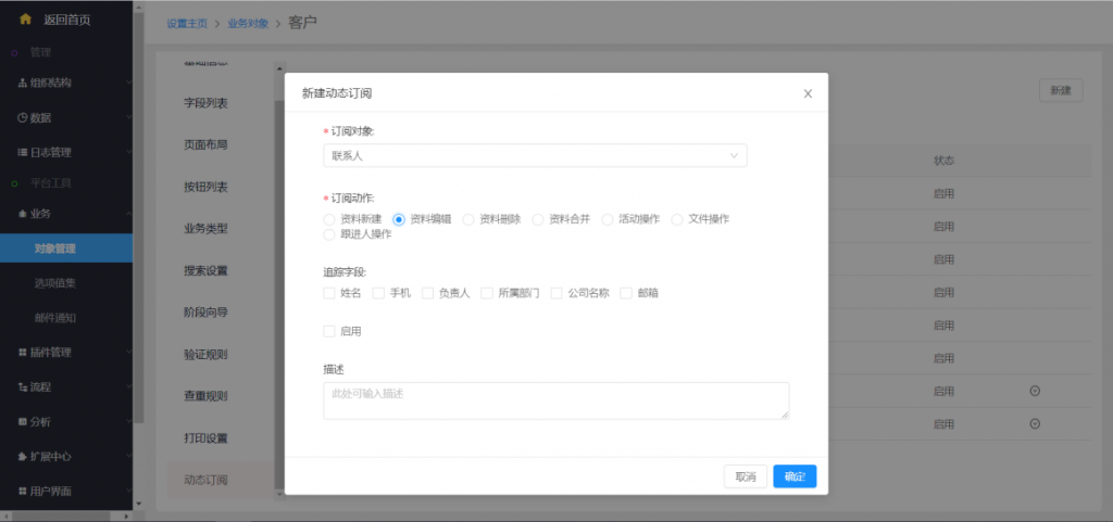 B 自定義訂閱動態:可以訂閱相關下游對象(包括明細)的系統默認動態到本對象的動態里:下游數據創建、下游數據修改、下游數據合并、下游數據活動操作、下游數據文件操作、下游數據跟進人操作