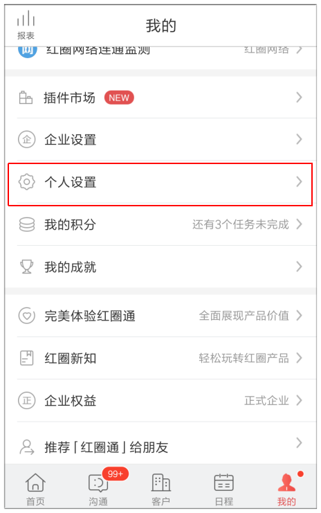 首先,打開紅圈通,進入【我的】,然后下拉屏幕點擊【個人設(shè)置】;