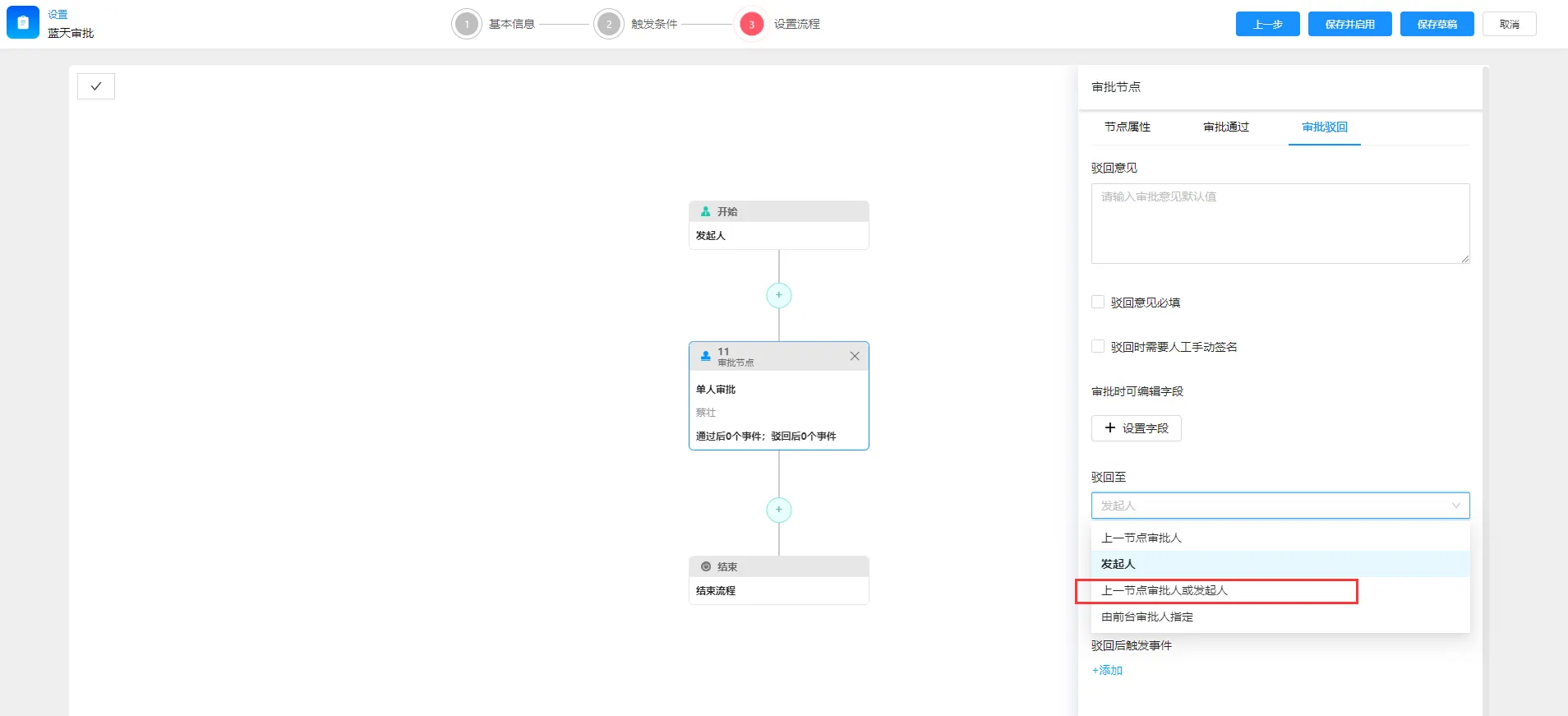 駁回可選駁回至上一節點或發起節點,前臺人員操作時可在上一節點和發起節點中選擇