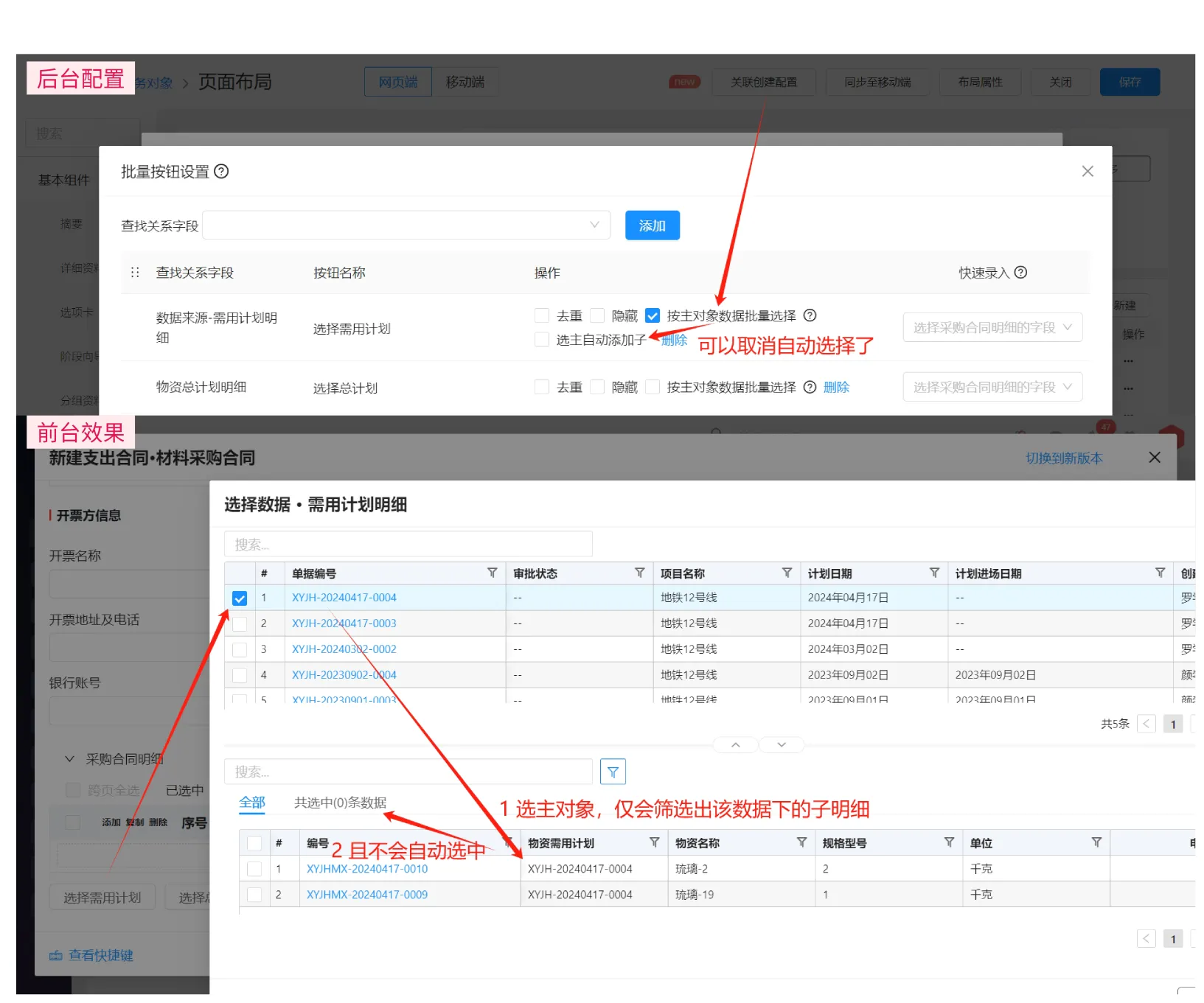 6、picker頁選主對象同時選中子明細功能,可以設置為不默認選中子,僅作為篩選縮小子明細的范圍,方便僅需要選擇部分數據的情況