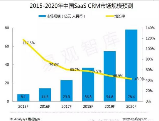 報(bào)告指出,國內(nèi)SaaS CRM市場在2014年的增長率達(dá)到了176.9%,市場規(guī)模從1.3億元人民幣增長到了3.7億元人民幣,2015年的增長率預(yù)計(jì)達(dá)到117.5%,市場規(guī)模增長到8.1億元人民幣。2015-2020年市場還會(huì)保持較高速度增長,但是隨著市場規(guī)模的逐漸擴(kuò)大,增長將趨于平穩(wěn),中國傳統(tǒng)中小企業(yè)的互聯(lián)網(wǎng)化轉(zhuǎn)型將成為市場規(guī)模增長的主要?jiǎng)恿ΓS著中國傳統(tǒng)中小企業(yè)互聯(lián)網(wǎng)化轉(zhuǎn)型的逐漸完成,SaaS CRM市場的企業(yè)數(shù)量將保持在一個(gè)平穩(wěn)的水平,市場的規(guī)模增長將來源于更加專業(yè)以及更加多元化的產(chǎn)品服務(wù)。