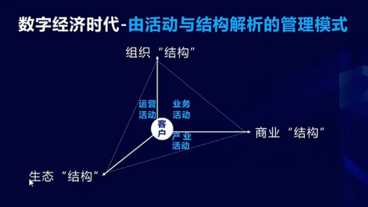 我們對于今天任何一個企業(yè)的數(shù)字化轉(zhuǎn)型,大家記住,跟工業(yè)時代不太一樣的是你得完成三個結(jié)構(gòu):一個結(jié)構(gòu)是現(xiàn)在有的組織架構(gòu),一個是你跟顧客關(guān)系的商業(yè)結(jié)構(gòu),還有一個是你跟產(chǎn)業(yè)關(guān)系的生態(tài)結(jié)構(gòu)。你必須得三個結(jié)構(gòu)都做到。如果你沒有能力,從組織結(jié)構(gòu)這個系統(tǒng)完成運營跟業(yè)務(wù)活動,從商業(yè)結(jié)構(gòu)這個系統(tǒng)完成業(yè)務(wù)跟產(chǎn)業(yè)活動,然后從產(chǎn)業(yè)結(jié)構(gòu)這個系統(tǒng)完成運營跟產(chǎn)業(yè)活動,你是不可能做數(shù)字化轉(zhuǎn)型的。