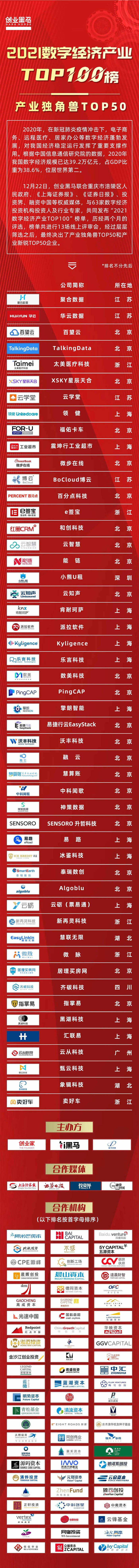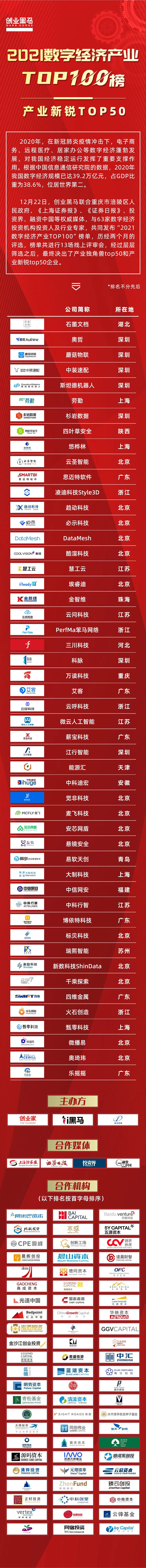 基于此,12月22日創(chuàng)業(yè)黑馬聯(lián)合重慶市涪陵區(qū)人民政府、《上海證券報(bào)》、《證券日報(bào)》、投資界、融資中國等權(quán)威媒體,與63家數(shù)字經(jīng)濟(jì)投資機(jī)構(gòu)投資人及行業(yè)專家,共同發(fā)布“2021數(shù)字經(jīng)濟(jì)產(chǎn)業(yè)TOP100”榜單。
