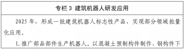 加強新型傳感、智能控制和優化、多機協同、人機協作等建筑機器人核心技術研究,研究編制關鍵技術標準,形成一批建筑機器人標志性產品。