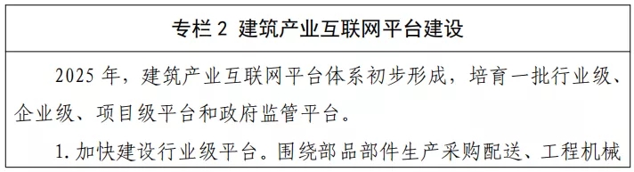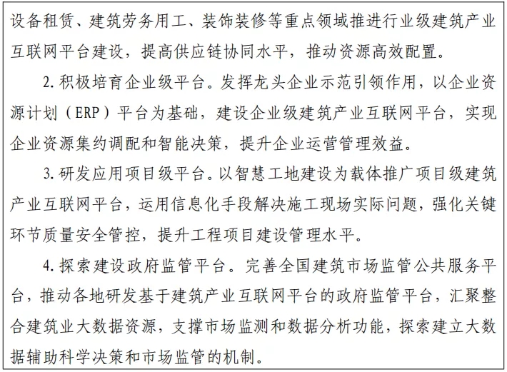 開展建筑產業互聯網平臺建設試點,培育一批行業級、企業級、項目級建筑產業互聯網平臺,建設政府監管平臺。