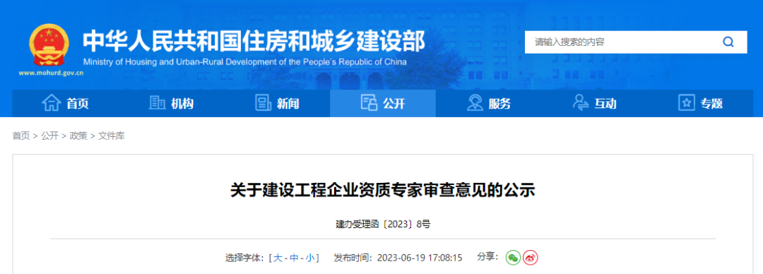 6月19日,住建部官網公示新一批建設工程企業資質專家審查意見,其中,僅同意一家建筑業企業升級特級資質: