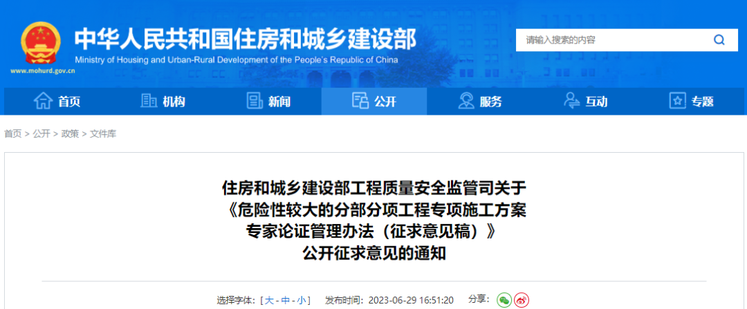 為健全房屋市政工程安全風險分級管控和隱患排查治理雙重預防機制,有效防范房屋市政工程生產安全事故,我司組織起草了《危險性較大的分部分項工程專項施工方案專家論證管理辦法(征求意見稿)》(見附件),現向社會公開征求意見。有關單位或個人請于2023年7月10日前,通過以下方式提出反饋意見: