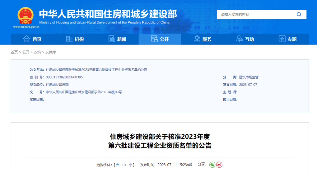 7月11日,住建部發(fā)布關(guān)于核準(zhǔn)2023年度第六批建設(shè)工程企業(yè)資質(zhì)名單的公告,其中16家建筑業(yè)企業(yè)“升特”: