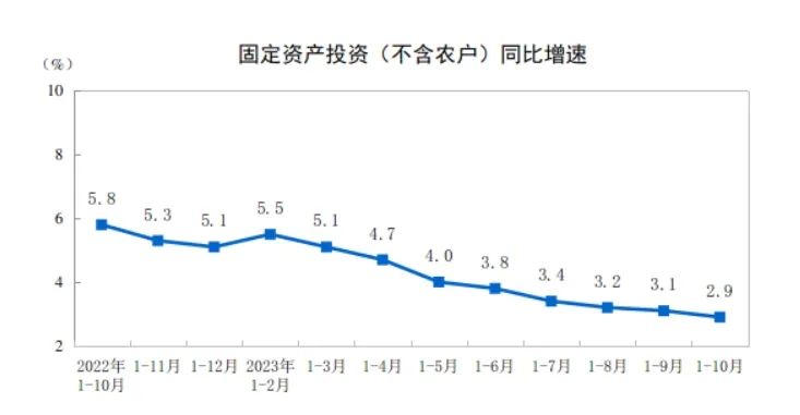 11月15日,國家統計局發布數據顯示,1—10月份,全國固定資產投資(不含農戶)419409億元,同比增長2.9%(按可比口徑計算,詳見附注7)。其中,民間固定資產投資215863億元,同比下降0.5%。從環比看,10月份固定資產投資(不含農戶)增長0.10%。