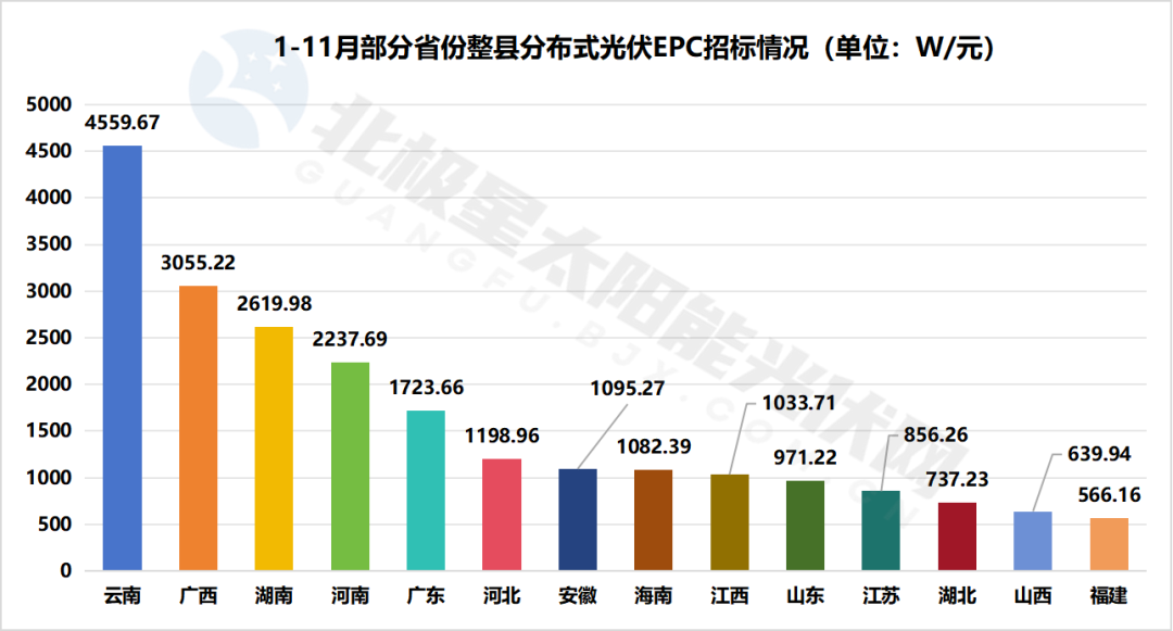 從區(qū)域分布來看,1-11月,國內(nèi)光伏電站EPC招標項目主要分布在云南、廣西、湖南、河南、廣東等22個省份。