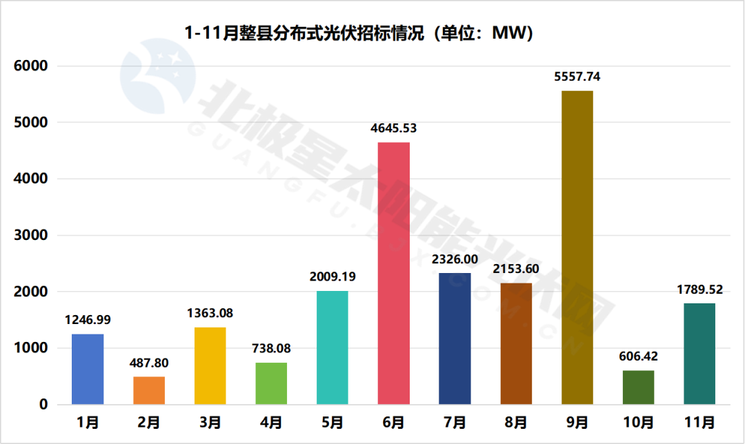 從時間分布的角度來看,除了2月、4月和10月之外,每個月的招標規(guī)模均達到了GW級別。其中,9月和6月的招標規(guī)模尤為突出,分別達到了5557.74MW和4645.53MW。