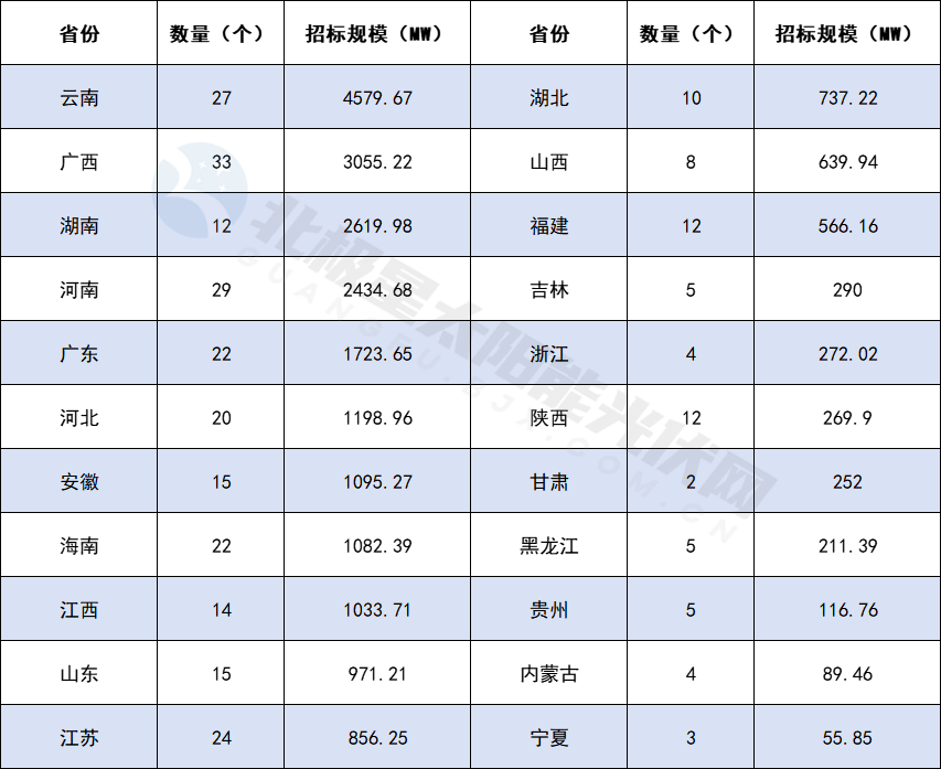 其中,云南以27個項目的總規(guī)模4579.67MW排名第一,而廣西則以33個項目的總規(guī)模3055.22MW緊隨其后。另外,湖南、河南、廣東、河北、安徽、海南、江西等省份的項目規(guī)模也達到了GW級別。