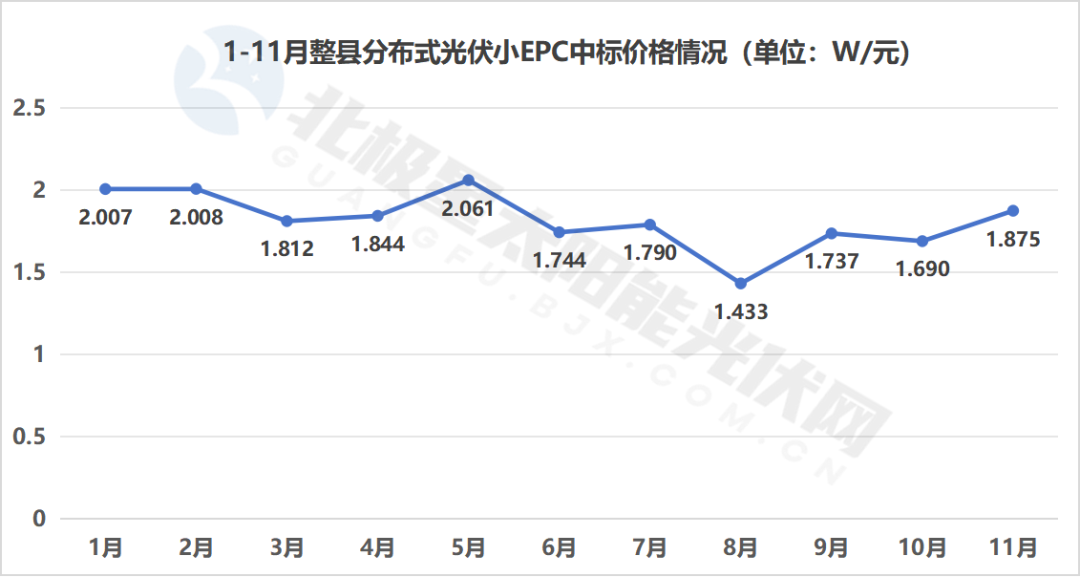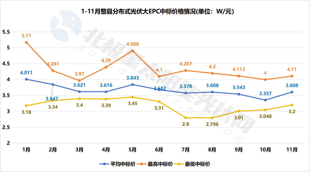 具體來看,1-11月大EPC項目的均價在逐漸下降,從年初的4.011元/W降至11月份的3.608元/W,其中,最高價格5.17元/W出現(xiàn)在1月,項目為國家能源集團鐵力整縣分布式光伏項目,最低價格2.796元/W在8月,項目為貴州華電畢節(jié)威寧縣整縣一期1.818MWp分布式光伏發(fā)電項目。