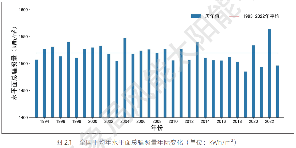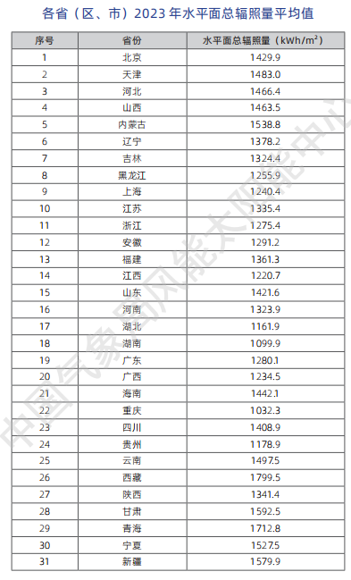 《公報》顯示,從水平面太陽能資源來看,2023年,全國太陽能資源總體為偏小年景全國平均水平面總輻照量約為1496.1千瓦時/平方米,較近30年平均值偏小1.58%(23.6千瓦時/平方米),較近10年平均值偏小1.27%(19.0千瓦時/平方米)。較 2022 年偏小75.4千瓦時/平方米。