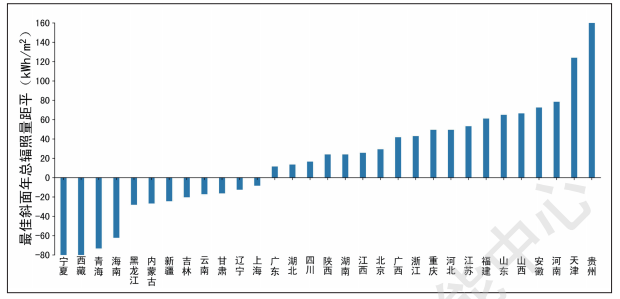 從各省(區、市)分布來看,吉林、云南、甘肅、遼寧、上海、廣東、湖北、四川最佳斜面總輻照量接近于近30年平均值。寧夏、西藏、青海、海南、黑龍江、內蒙古、新疆偏小 20kWh/m2 以上。陜西、湖南、江西、北京、廣西、浙江、重慶、河北、江蘇、福建、山東、山西、安徽、河南、天津、貴州偏大 20kWh/m2 以上。