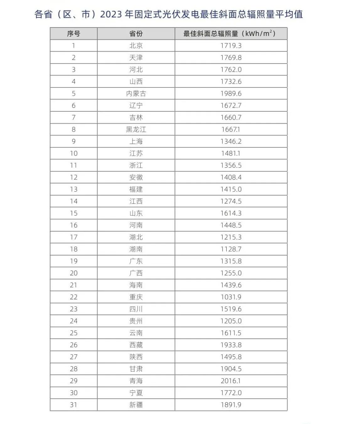 2023 年,我國大部分地區最佳斜面總輻照量超過1100千瓦時/平方米,首年利用小時數在 900 小時以上。其中,新疆、 內蒙古、西北地區中西部、華北北部、西藏、西南地區西部等地最佳斜面總輻照量超過1800千瓦時/平方米,首年利用小時數在1400 小時以上;四川東部、重慶、貴州北部、湖南西部、 湖北西南部等地在1100千瓦時/平方米 以下,首年利用小時數一般低于900小時