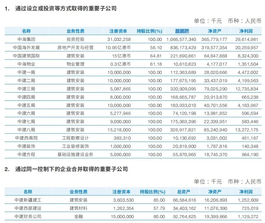 2023年度報告中,中國建筑公布重要子公司的總資產(chǎn)、凈資產(chǎn)和凈利潤等數(shù)據(jù),具體如下: