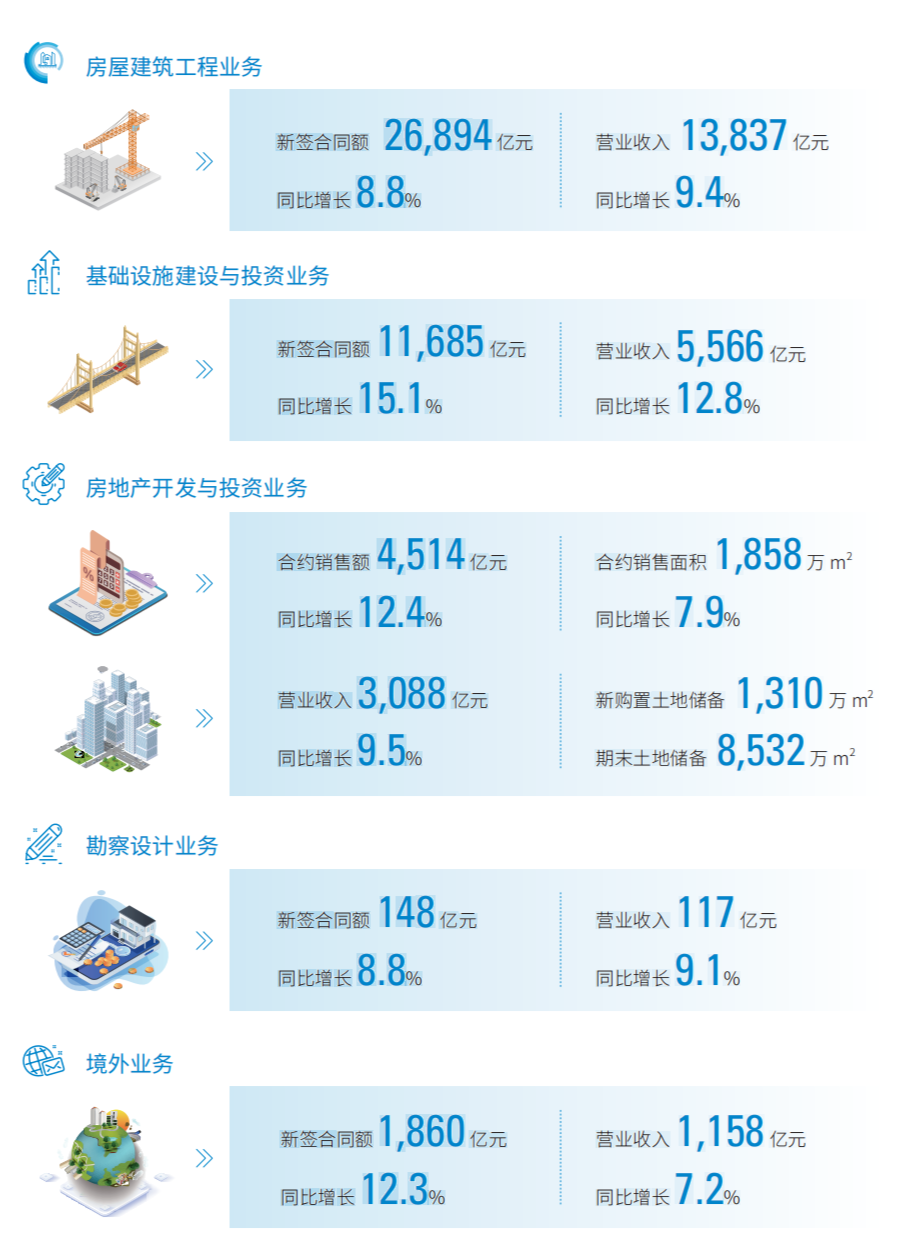 房建業(yè)務(wù)結(jié)構(gòu)持續(xù)優(yōu)化,新簽合同額26894億元,同比增長8.8%,營業(yè)收入13837億元,同比增長9.4%;