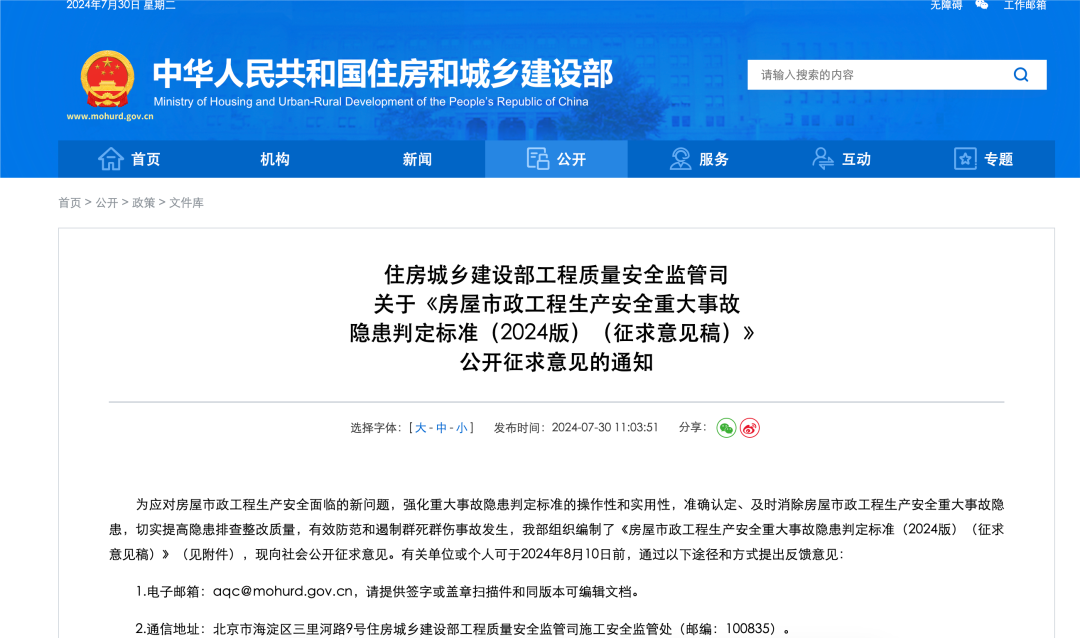 為應(yīng)對房屋市政工程生產(chǎn)安全面臨的新問題,強化重大事故隱患判定標(biāo)準(zhǔn)的操作性和實用性,準(zhǔn)確認定、及時消除房屋市政工程生產(chǎn)安全重大事故隱患,切實提高隱患排查整改質(zhì)量,有效防范和遏制群死群傷事故發(fā)生,我部組織編制了《房屋市政工程生產(chǎn)安全重大事故隱患判定標(biāo)準(zhǔn)(2024版)(征求意見稿)》(見附件),現(xiàn)向社會公開征求意見。有關(guān)單位或個人可于2024年8月10日前,通過以下途徑和方式提出反饋意見: