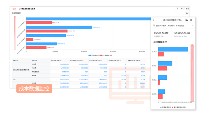 目標成本智能對標:系統支持導入目標成本總計劃,實時歸集人、材、機等實際成本數據,自動比對差異并觸發預警。例如,當某項目鋼筋采購量超計劃10%時,系統將自動凍結后續采購申請,避免成本失控。